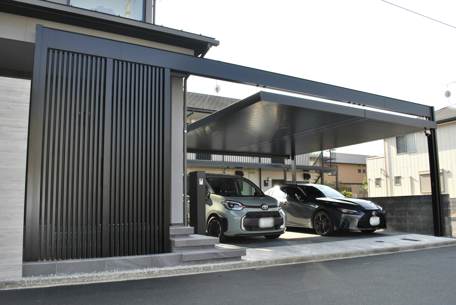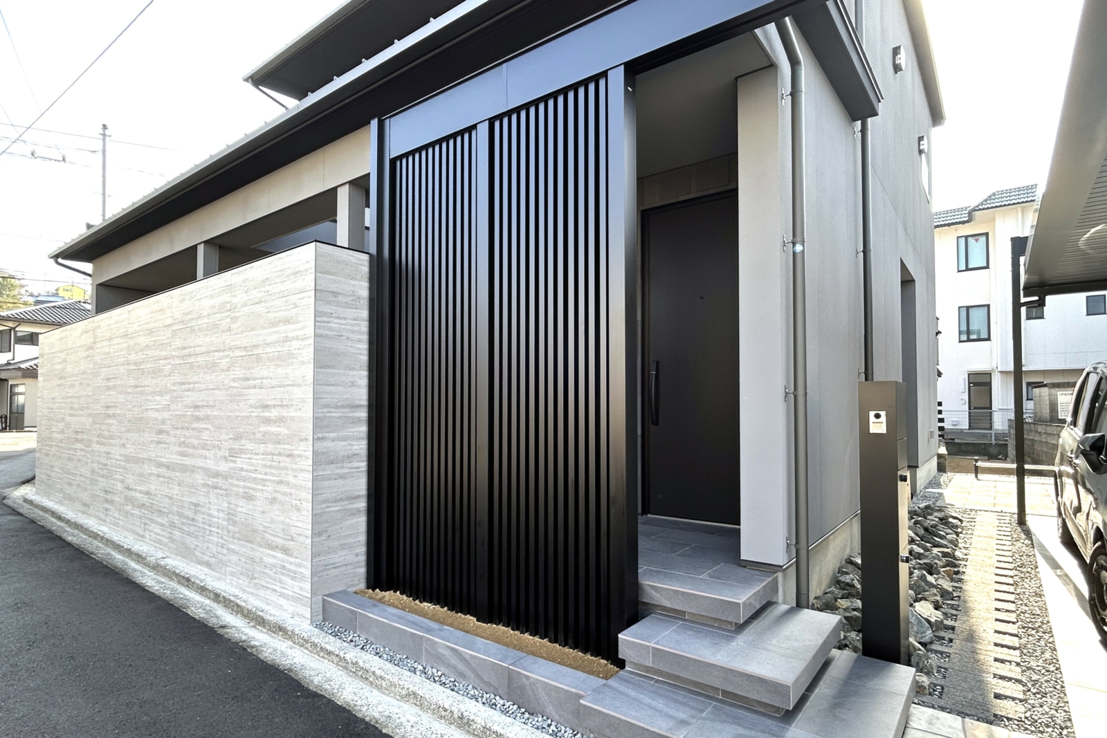 カーポートの梁下に取り付け可能なデザインユニットを玄関前の目隠しに採用しました。